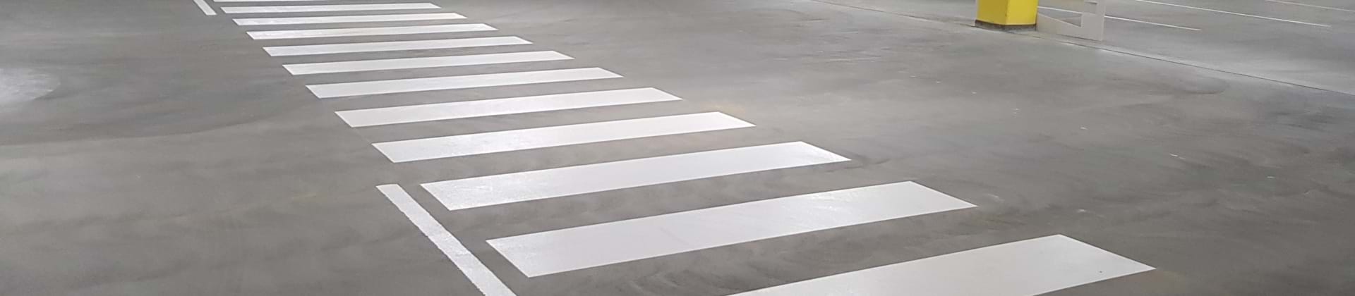 Epoxystriber er malet på gulvet, for indikation af parkeringsbåse og fodgængerfelter til de besøgende i kælderen.
