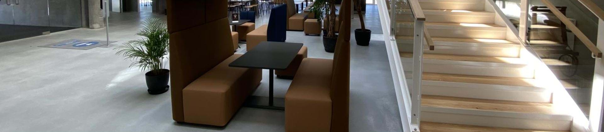 The trendy meeting and dining areas with the raw, Salt’N’peber polished floors are a perfect addition to the bright airy spaces and the modern look of the building.