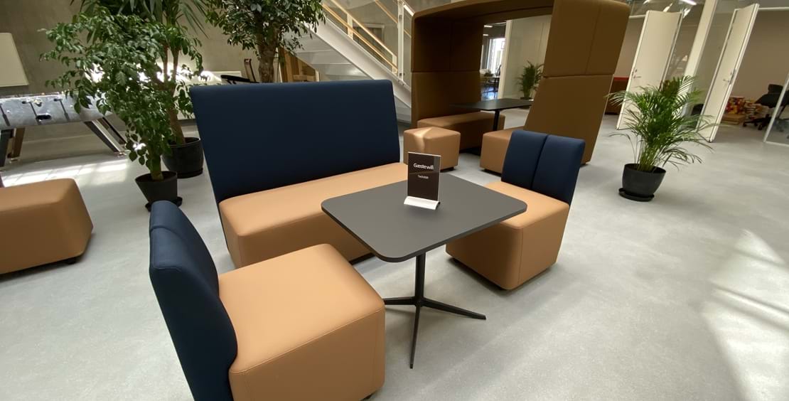 De uformelle møde- og spiseområder med de rå, Salt’N’peber slebne gulve er en perfekt tilføjelse til de lyse luftige rum og bygningens moderne udseende.