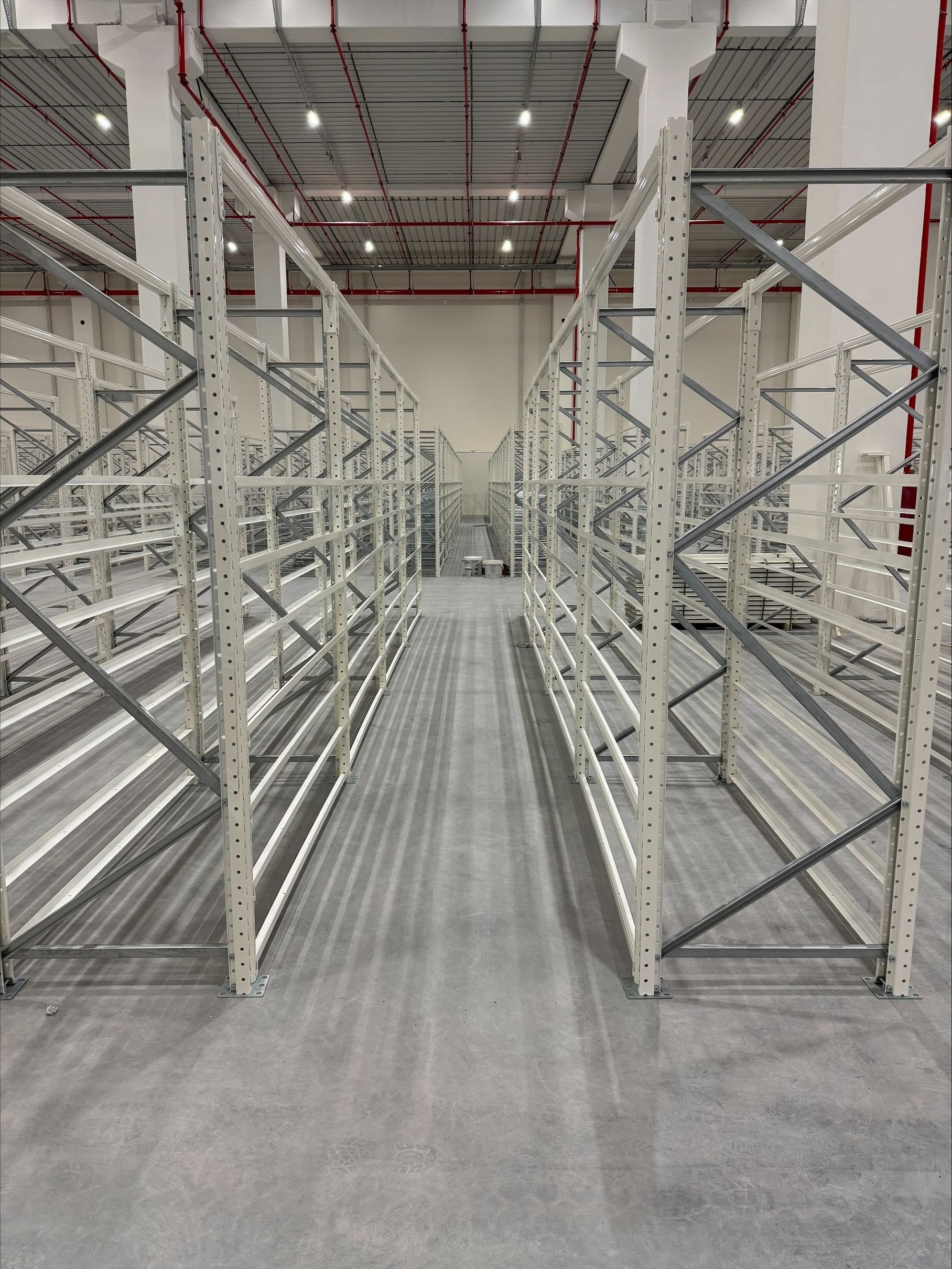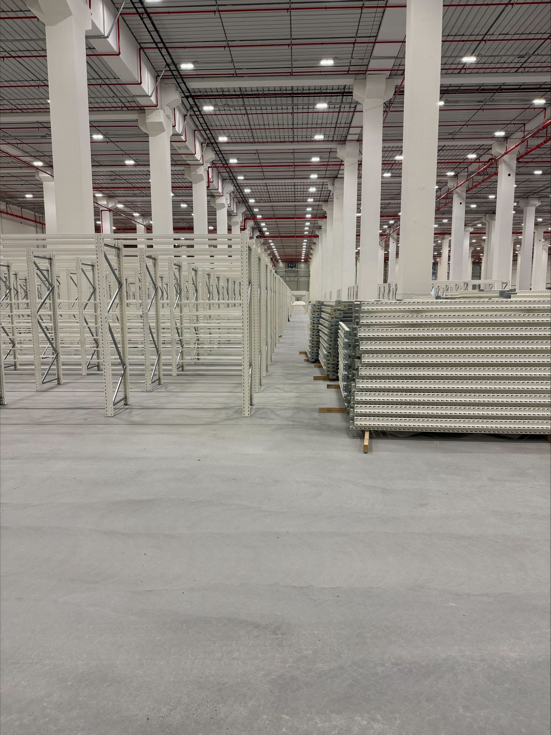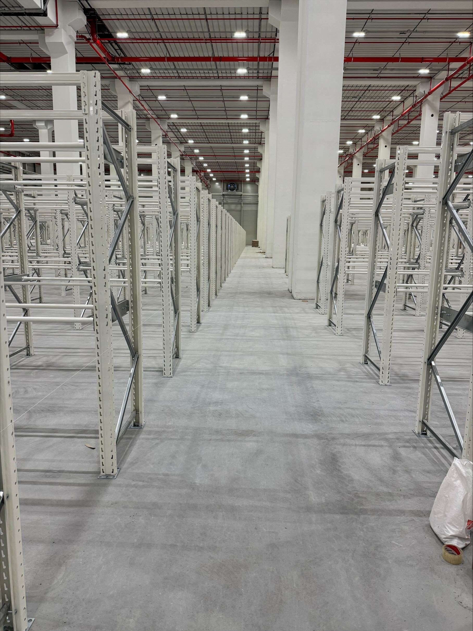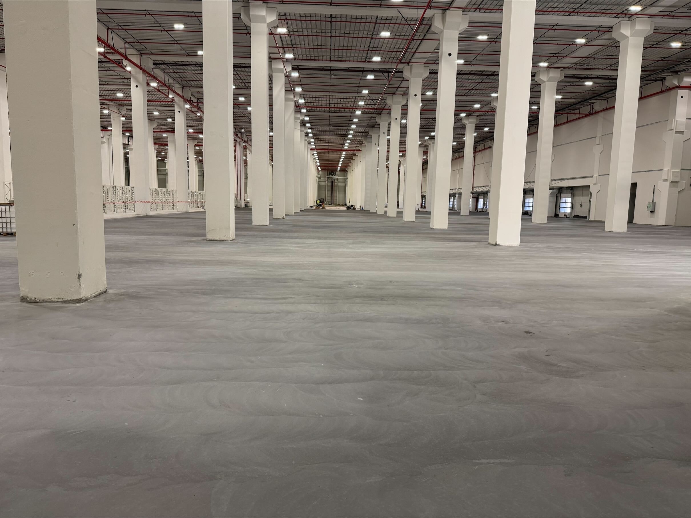 Slidlaget udlægges på et armeret betondæk i en to-etagers bygning med en samlet højde på mere end 30 meter. Projektet stiller høje krav til både udførelse og koordinering, da gulvløsningen indgår i en stor lagerbygning med betydelig højde og konstruktion.