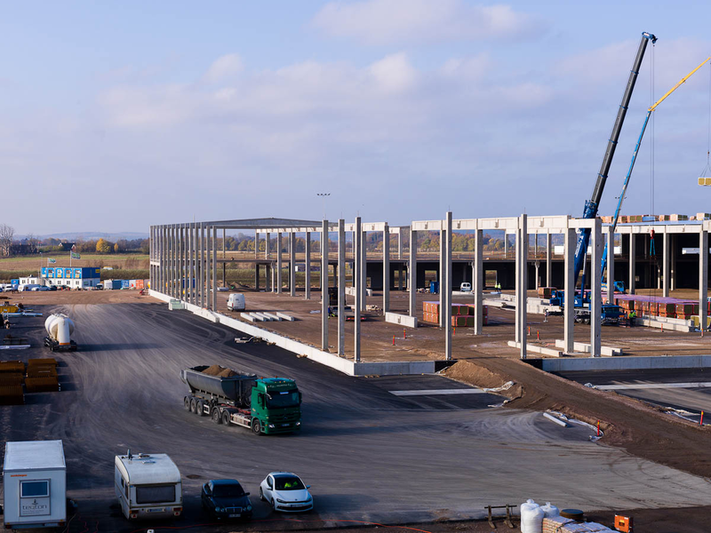 Lagerbyggnad med stomme och fasader i betong, Betonggolv Teqbase/ Teqplan.