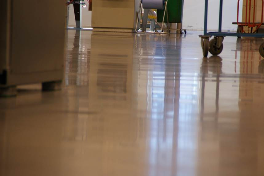 Teqplan slitlagret har sedan vattenglas-impregnerats och diamantslipats i sju steg för en tät och glansig yta.